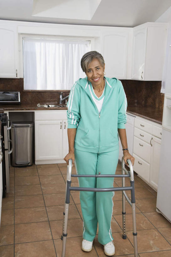 西方人,一个人,站,笑,微笑,露齿笑,竖图,室内,白天,正面,运动服,厨房,欧洲,非洲,黑人,欧洲人,仅一个女性,仅一个人,握,服装,电器,工具,冰箱,拿,拿着,注视,冷冻,冷柜,衣服,绿色,冷藏柜,观察,看,站着,器械,握着,服饰,仅一个老年女性,冷藏,拐杖,观看,储藏,察看,家电,家用电器,衣着,穿着,关注,医疗器械,助行器,辅助设备,保鲜,衣饰,老年女性,女人,女性,非洲人,站立,彩图,全身,灶间,四脚拐杖,助步器,运动装